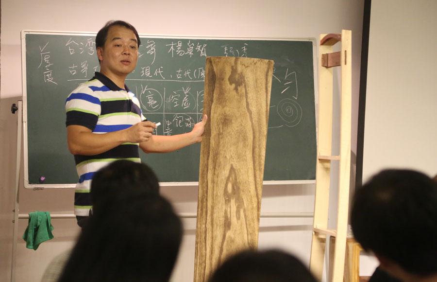 楊崇智先生聲情並茂講解現代折面箏中框架的結構特征,並且以實際木料框架進行演示,在場“學生”聽得十分認真。
